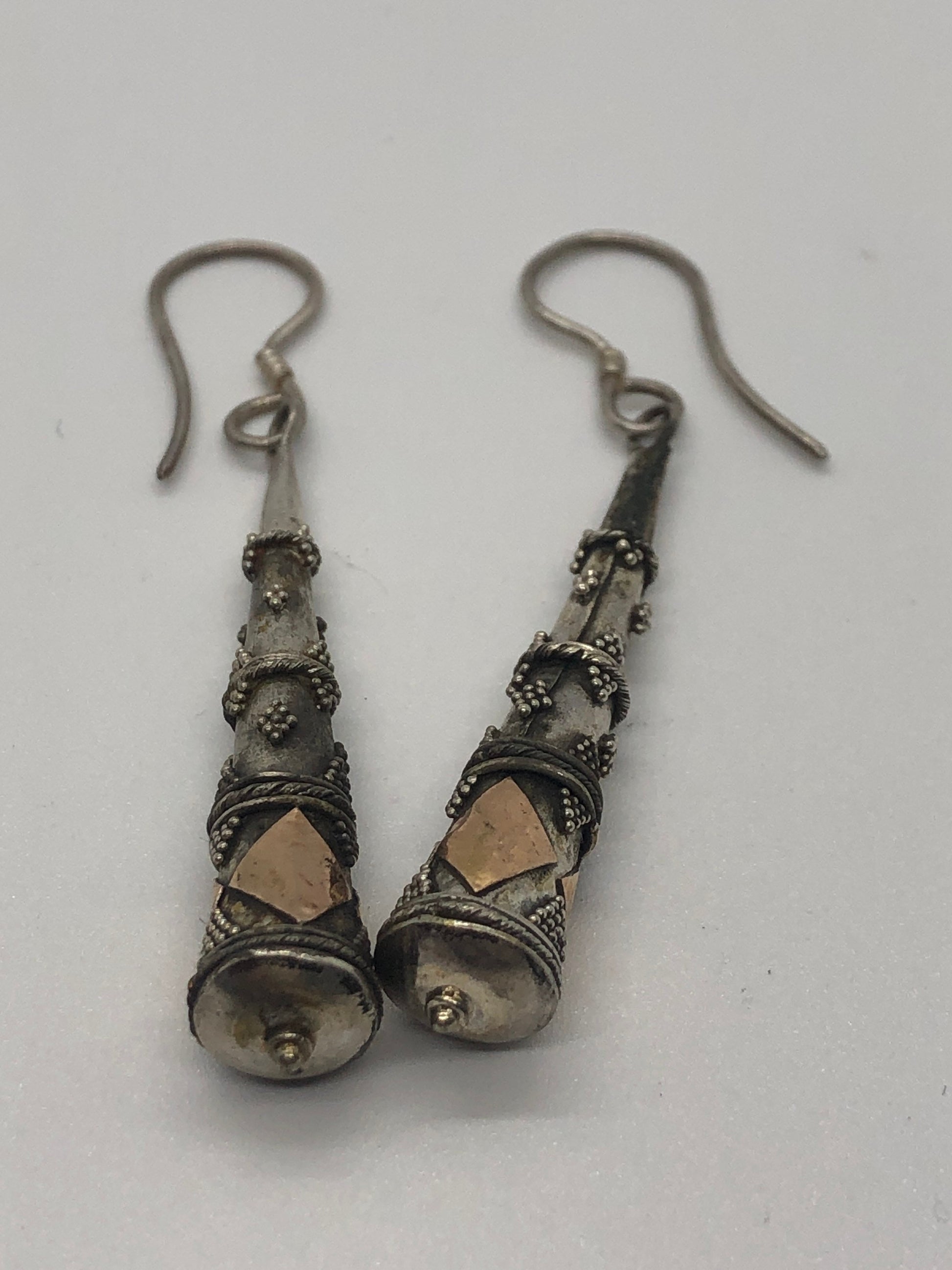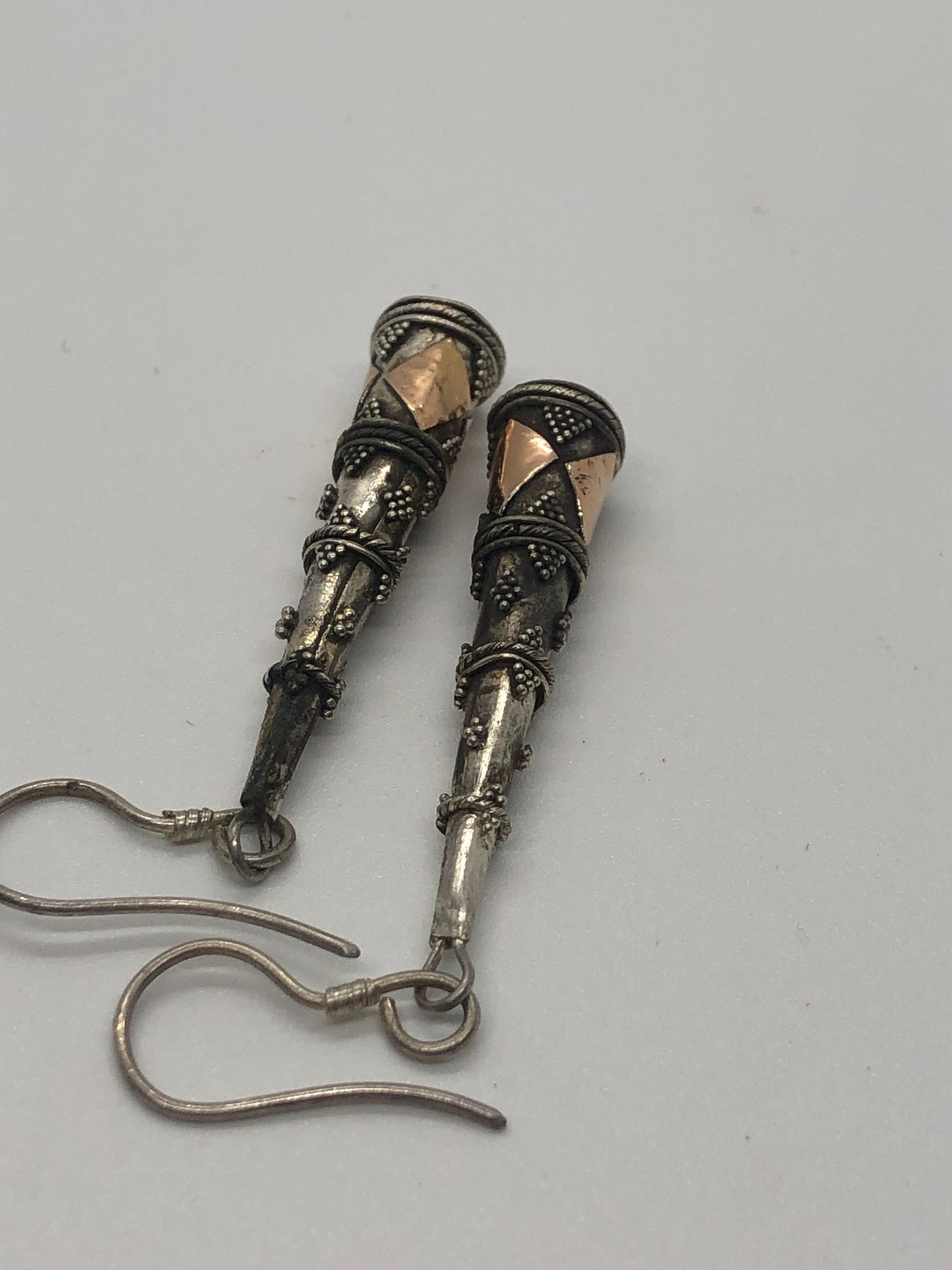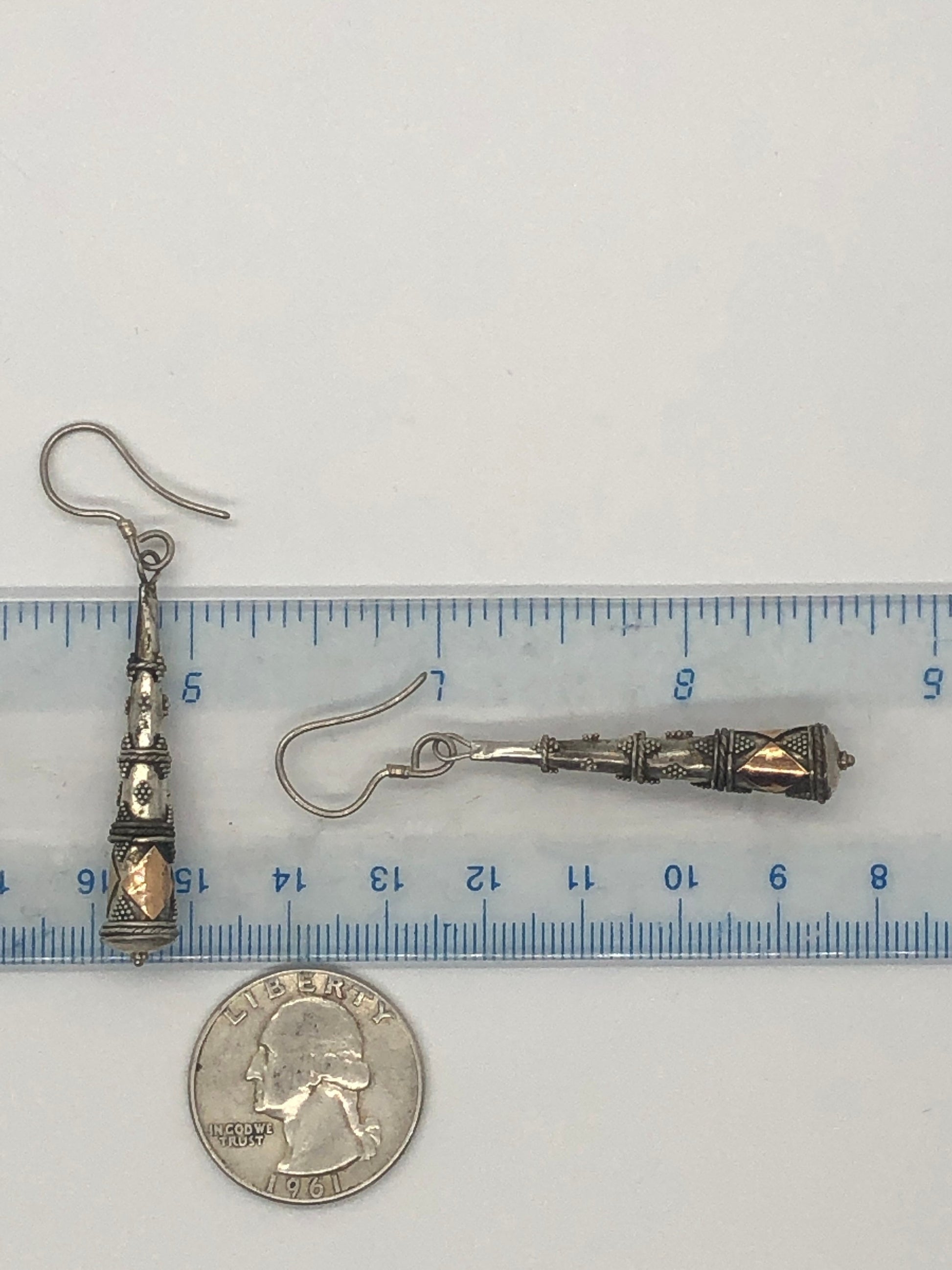 1.5inches with ear wire 2.25 inches long These are vintage silver earrings and as such, they do have a slight patina. I will let the buyer decide whether to keep it or not:) Also, being hand made each pair has small variances. I have a very similar pairs listed in another listing.To see other wonderful items click the links below: Click this link to see Vintage Shaker Locketshttps://www.etsy.com/shop/TimeTalentNTreasures?ref=seller-platform-mcnav§ion_id=28856113Click this link to see Handmade Crafted Shaker Locketshttps://www.etsy.com/shop/TimeTalentNTreasures?ref=seller-platform-mcnav§ion_id=32189637Click this link to see Handmade Bullet Shaker Locketshttps://www.etsy.com/shop/TimeTalentNTreasures?ref=seller-platform-mcnav§ion_id=29685070Click this link to see Handmade Vintage Bullet Shaker Locketshttps://www.etsy.com/shop/TimeTalentNTreasures?ref=seller-platform-mcnav§ion_id=32738269Click this link to see Vintage Silver Earringshttps://www.etsy.com/shop/TimeTalentNTreasures?ref=seller-platform-mcnav§ion_id=29685074