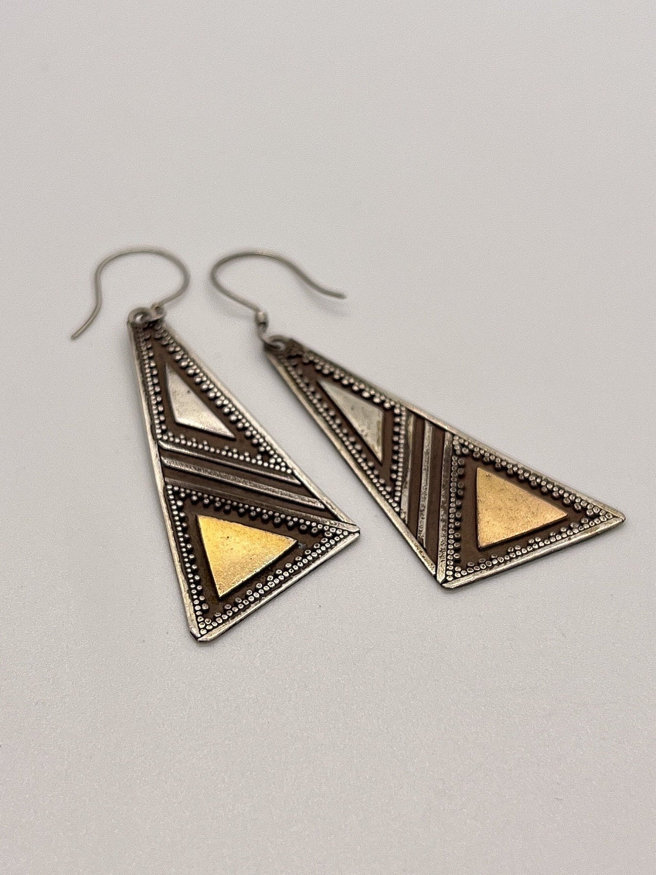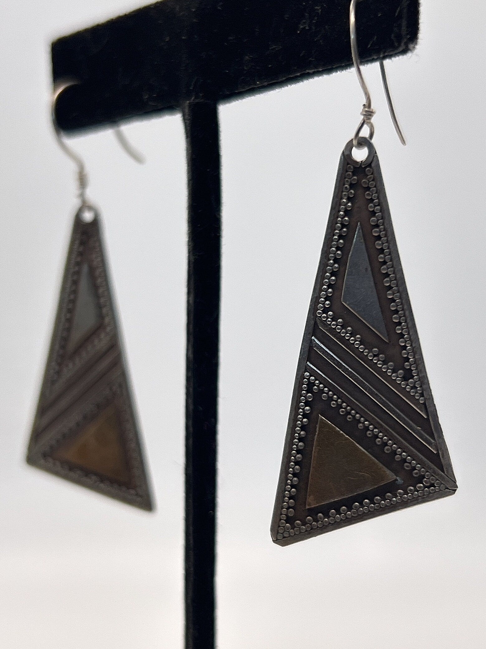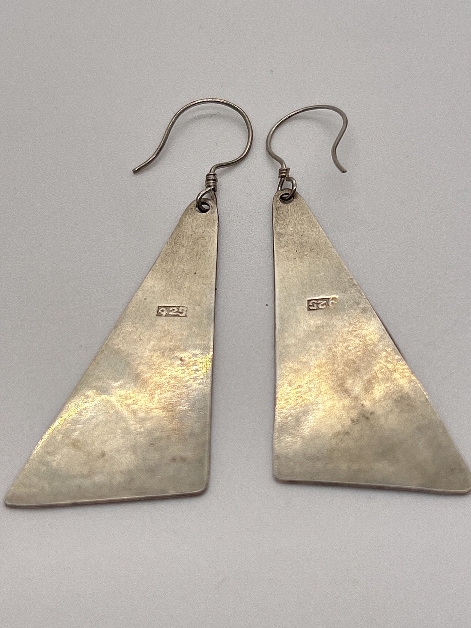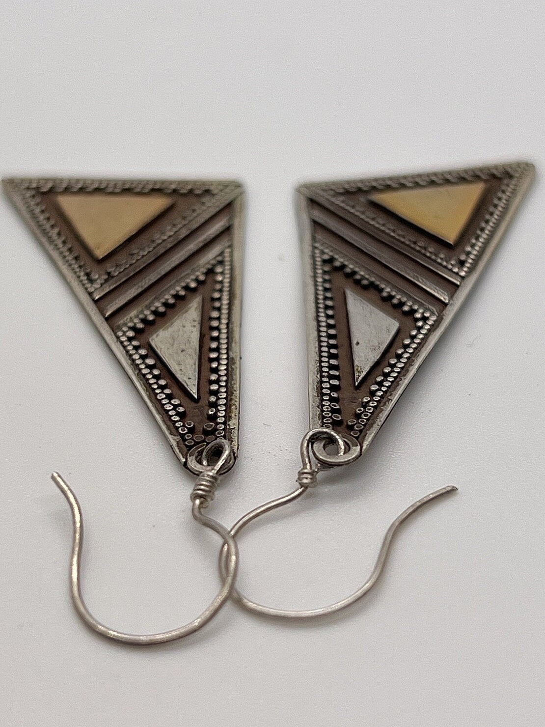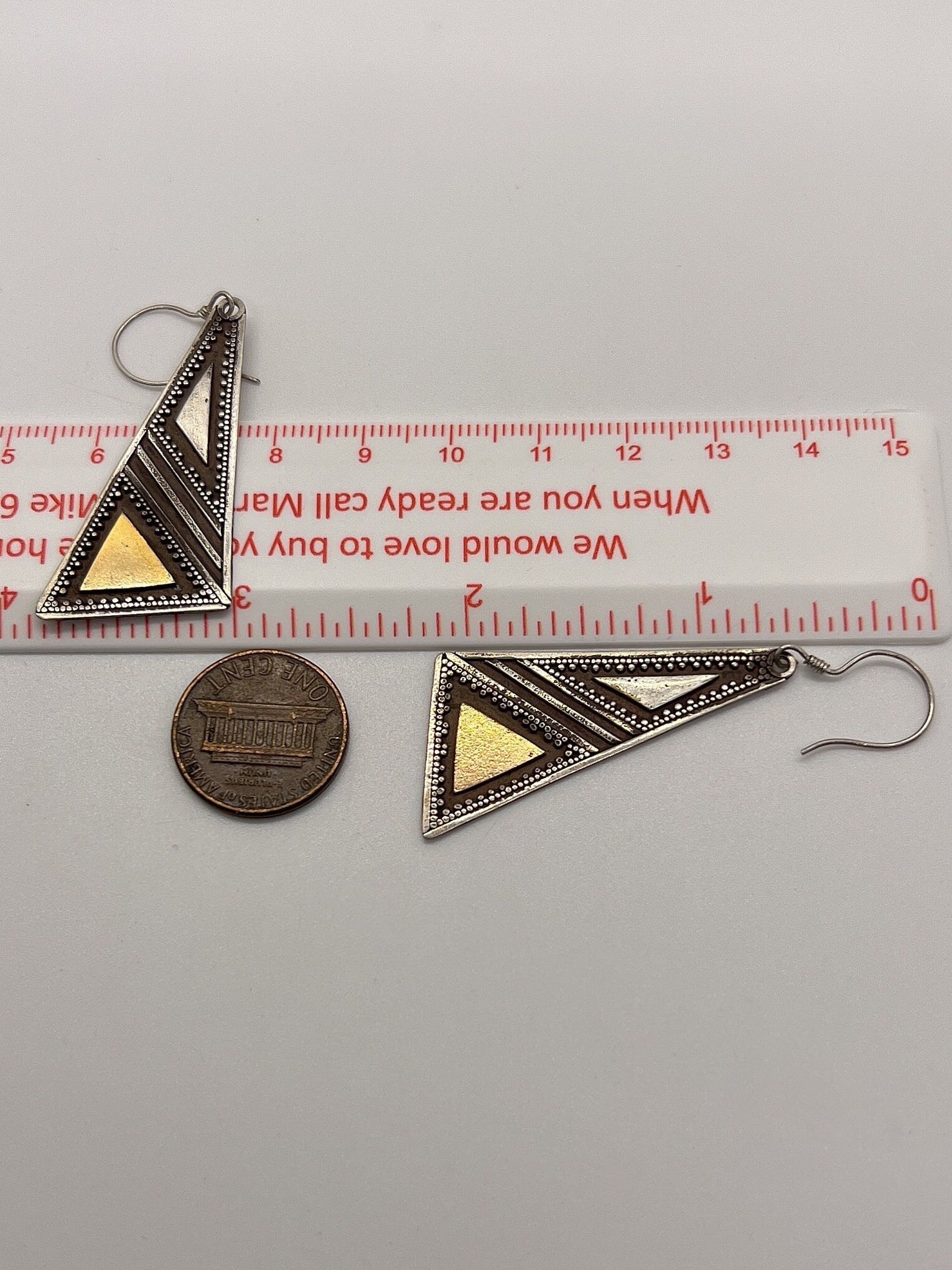 2 inches with ear wire 3/4 of an inch wide These are vintage silver earrings and as such, they do have a slight patina. I will let the buyer decide whether to keep it or not:) Also, being hand made each pair has small variances. I have a very similar pairs listed in another listing.To see other wonderful items click the links below: Click this link to see Vintage Shaker Locketshttps://www.etsy.com/shop/TimeTalentNTreasures?ref=seller-platform-mcnav§ion_id=28856113Click this link to see Handmade Crafted Shaker Locketshttps://www.etsy.com/shop/TimeTalentNTreasures?ref=seller-platform-mcnav§ion_id=32189637Click this link to see Handmade Bullet Shaker Locketshttps://www.etsy.com/shop/TimeTalentNTreasures?ref=seller-platform-mcnav§ion_id=29685070Click this link to see Handmade Vintage Bullet Shaker Locketshttps://www.etsy.com/shop/TimeTalentNTreasures?ref=seller-platform-mcnav§ion_id=32738269Click this link to see Vintage Silver Earringshttps://www.etsy.com/shop/TimeTalentNTreasures?ref=seller-platform-mcnav§ion_id=29685074