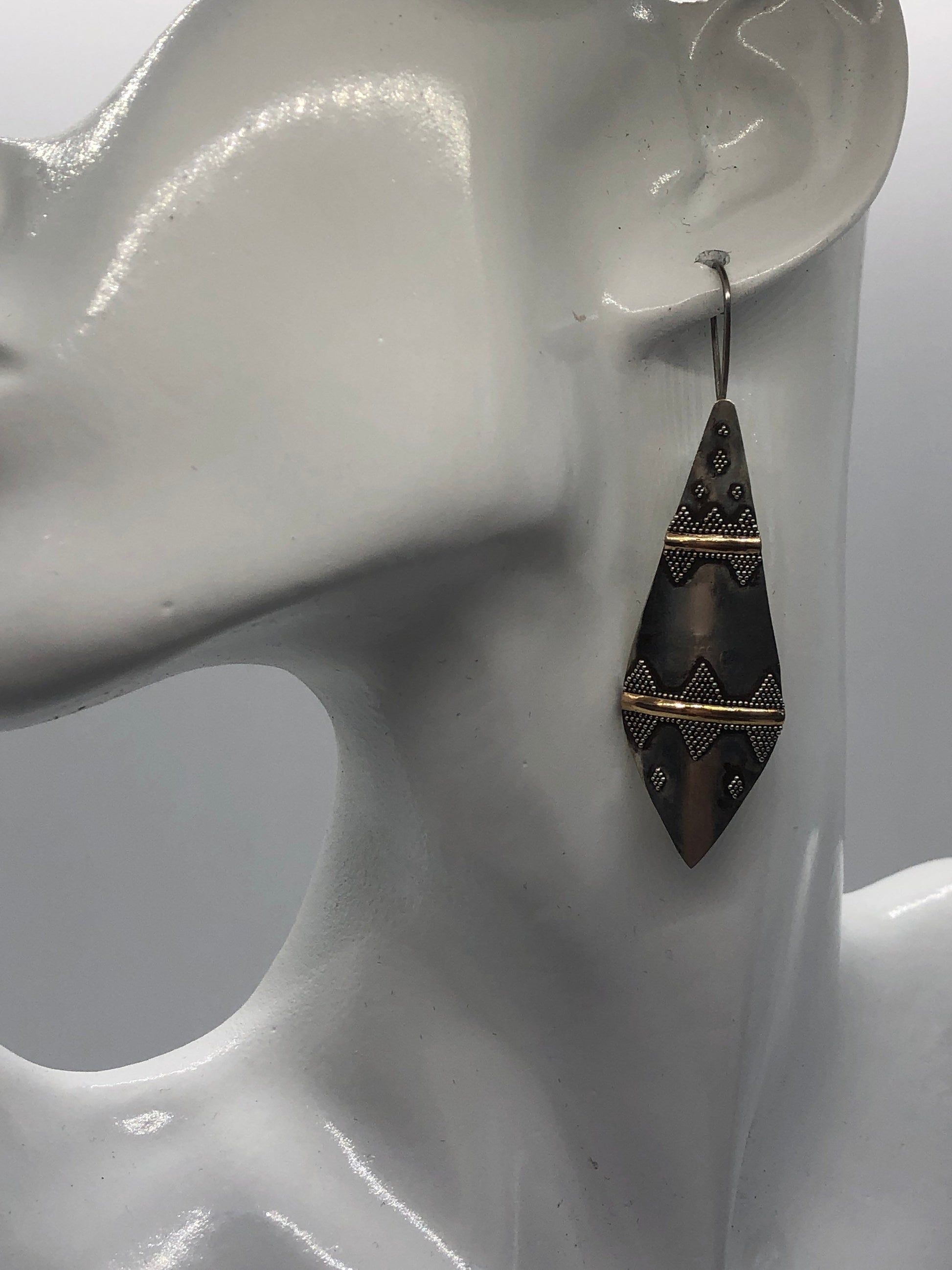 Handmade Sterling Silver Dangle Earrings Indonesia, Vintage new old stock. These were bought by me in the late 90's at an estate sale. They have been in my attic since then. They were new unworn items. These are made of sterling silver with a gold wash. They are French hook earrings and are finely crafted in Indonesia. Very large substantial earrings with a wonderful design. They look like shields. There are only 6 pairs total and when they are gone, they are gone:)