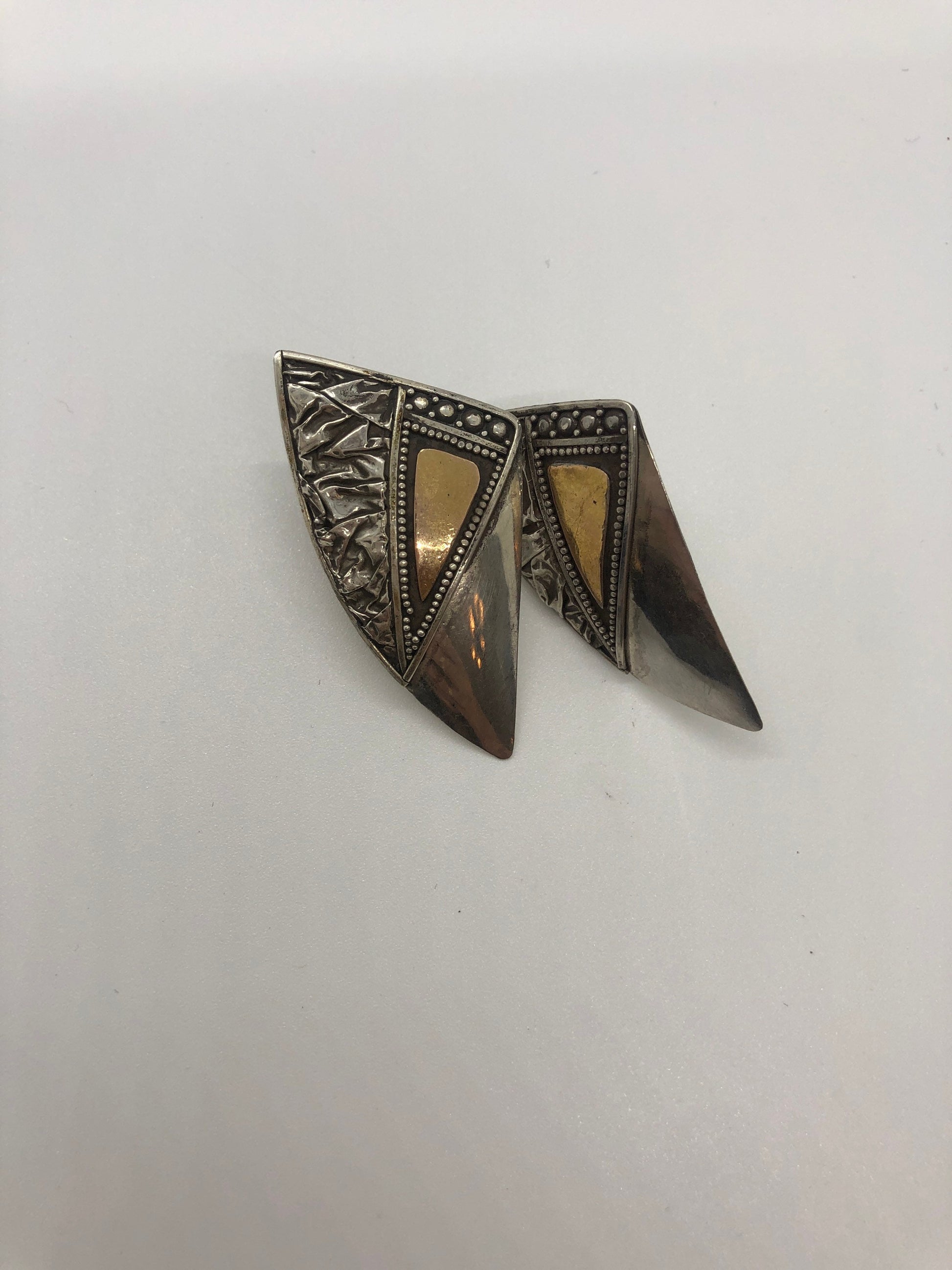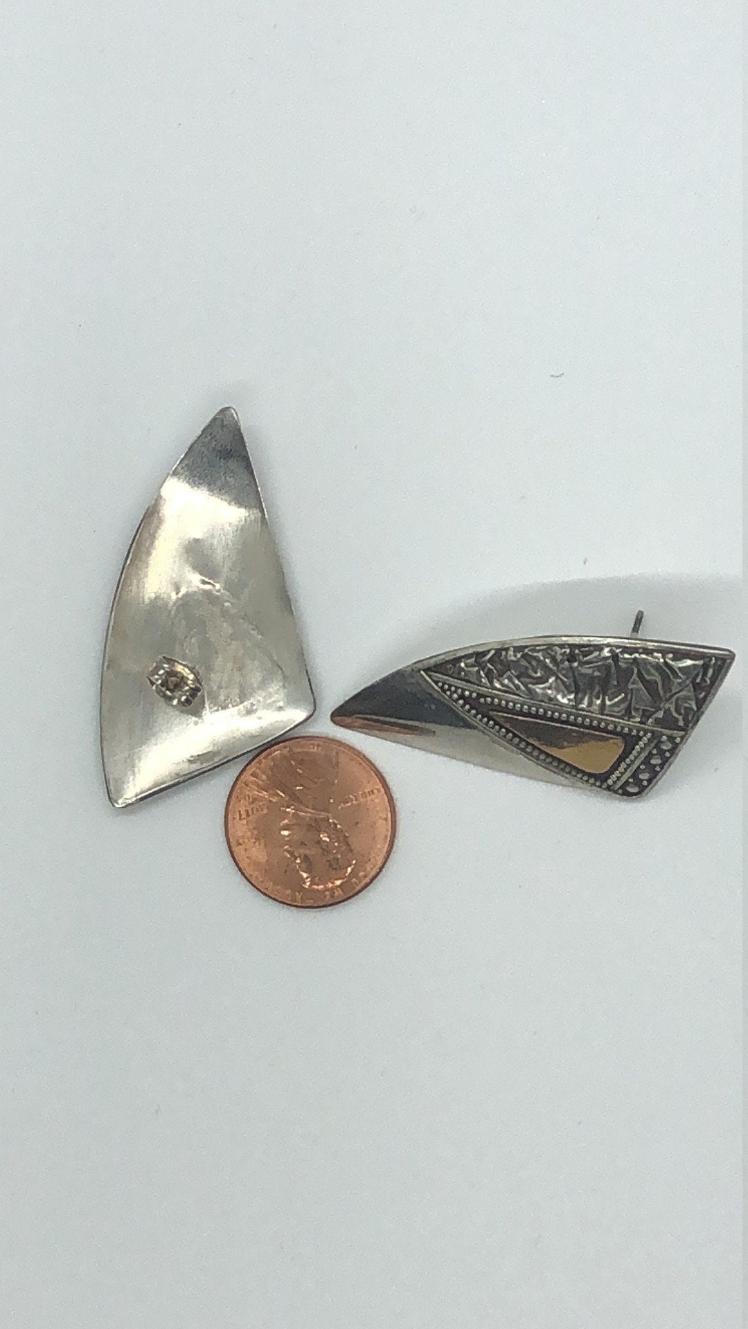 Handmade Sterling Earrings, Indonesia, Vintage new old stock. These were bought by me in the late 90's at an estate sale. They were new unworn items. These are hallmarked are 925 and are made of sterling silver. They are post back earrings and are finely crafted in Indonesia. I have only 5 pairs of these. There is a wonderful Gold wash over the sterling as shown in pick. As these are vintage there is a nice patina, however, I will leave that up to the buyer to decide to keep or not. I think these look like a shield.