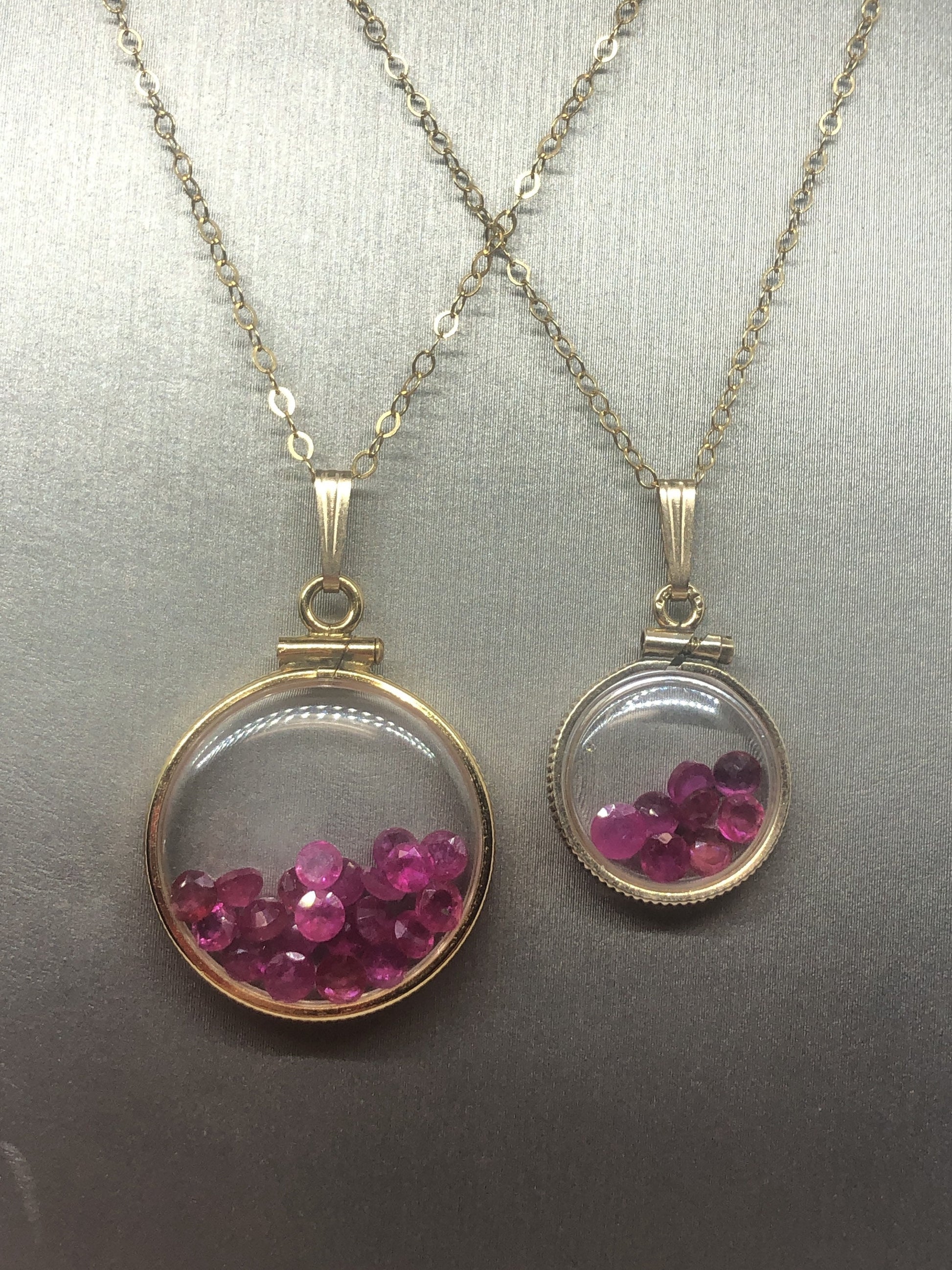 Up for sale: A 20 mm or 15 mm Vintage 12k gold filled shaker locket glowing RED with JULY'S birthstone gems inside. If your birthstone is RUBY (birthstone for July) or you just like cool eye catching vintage jewelry, then this locket is for you.