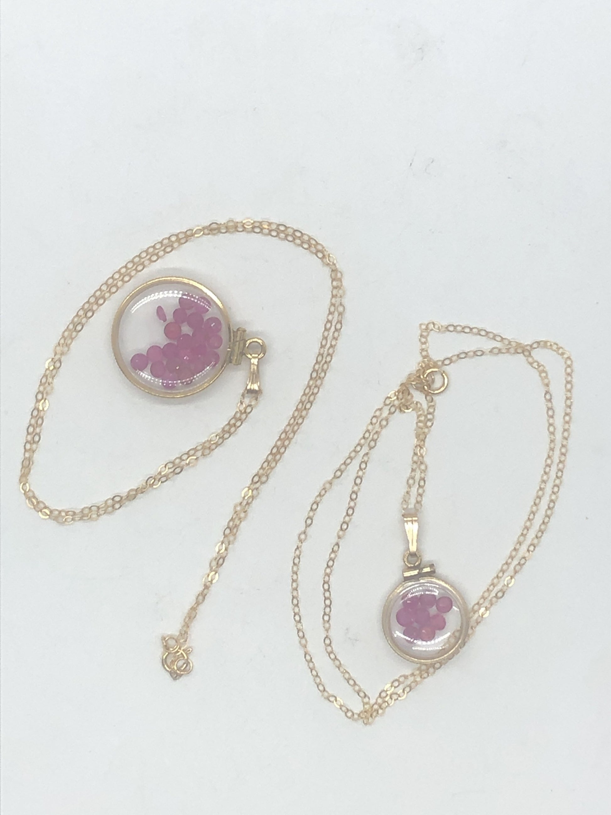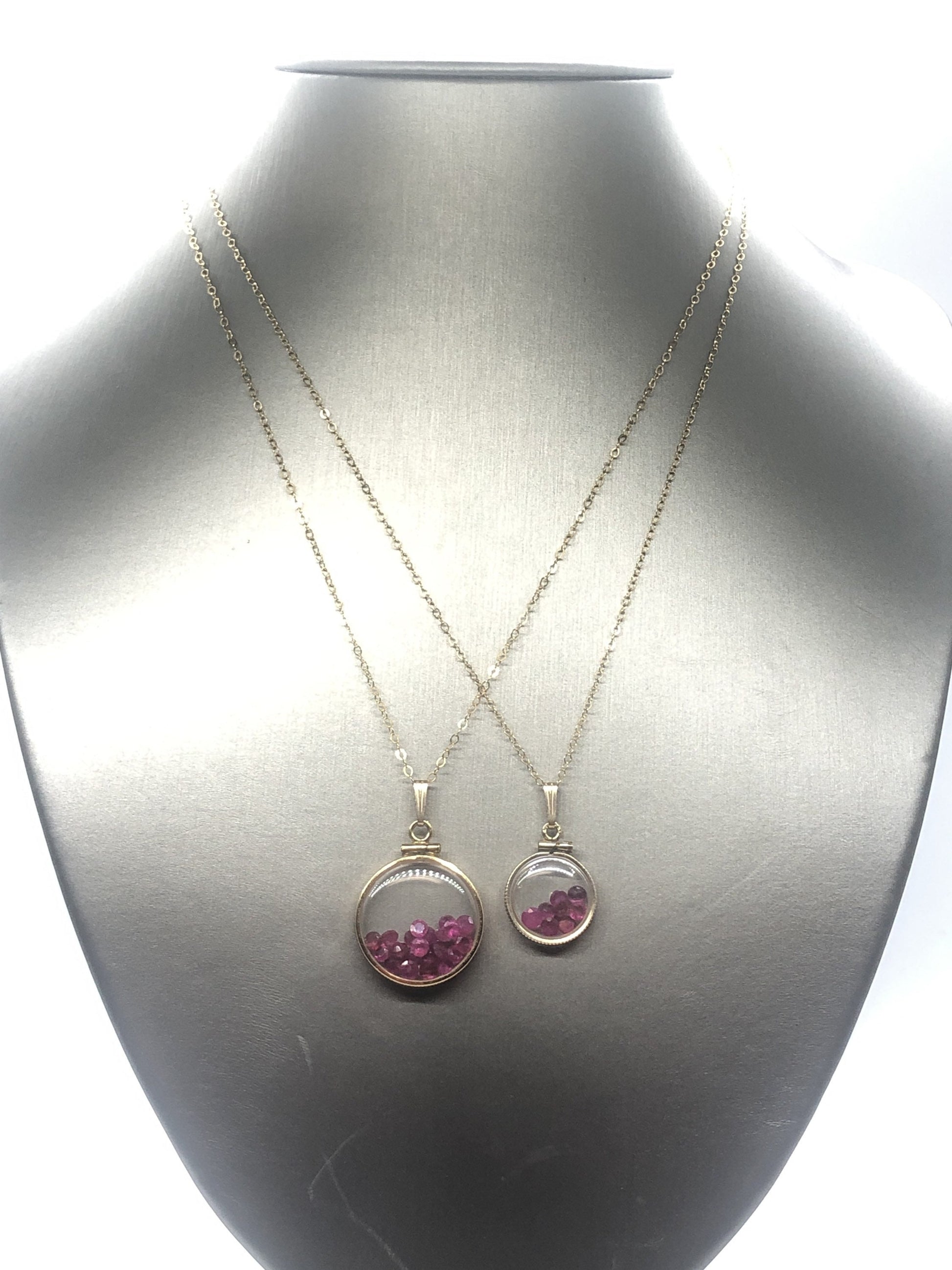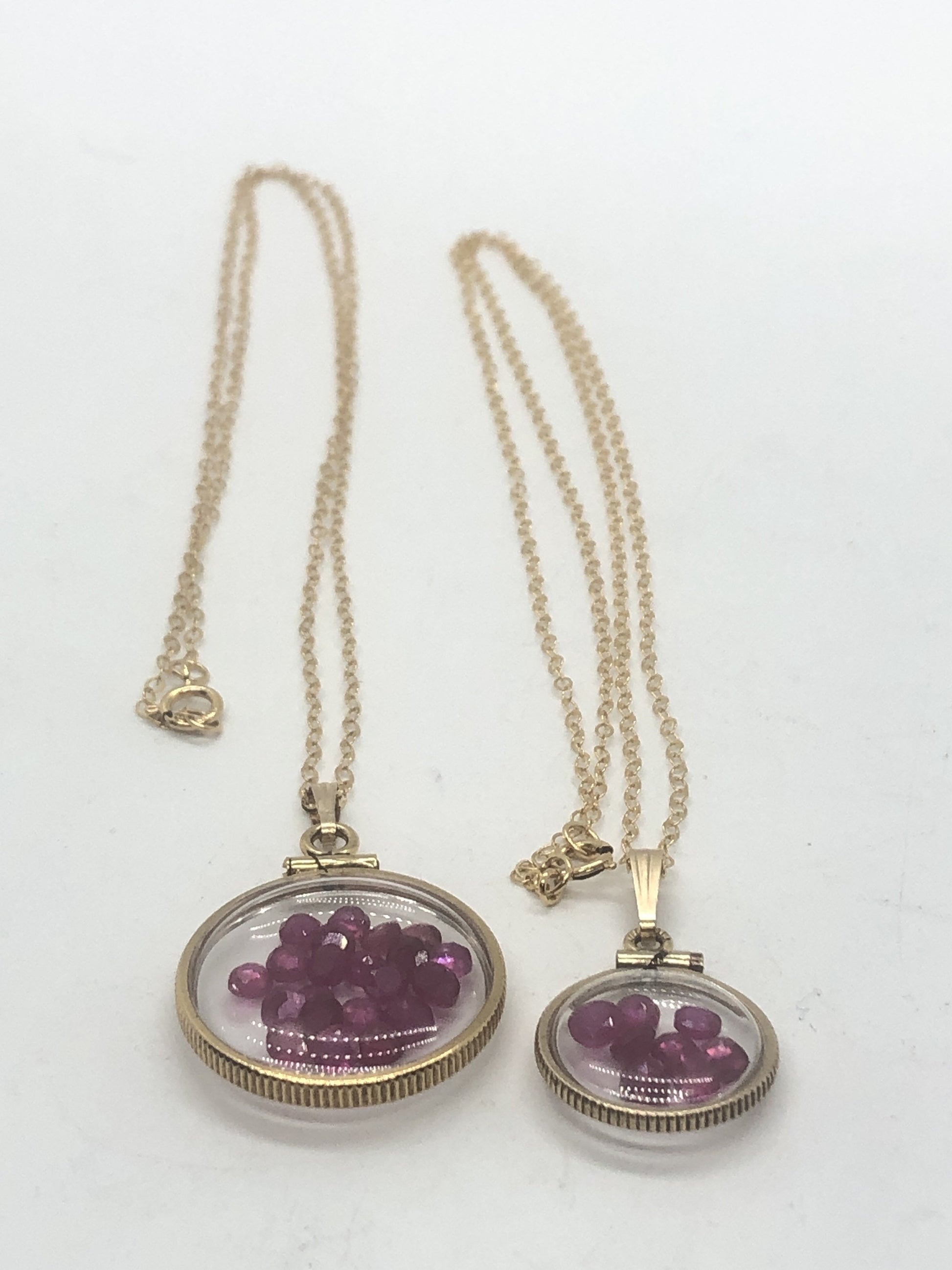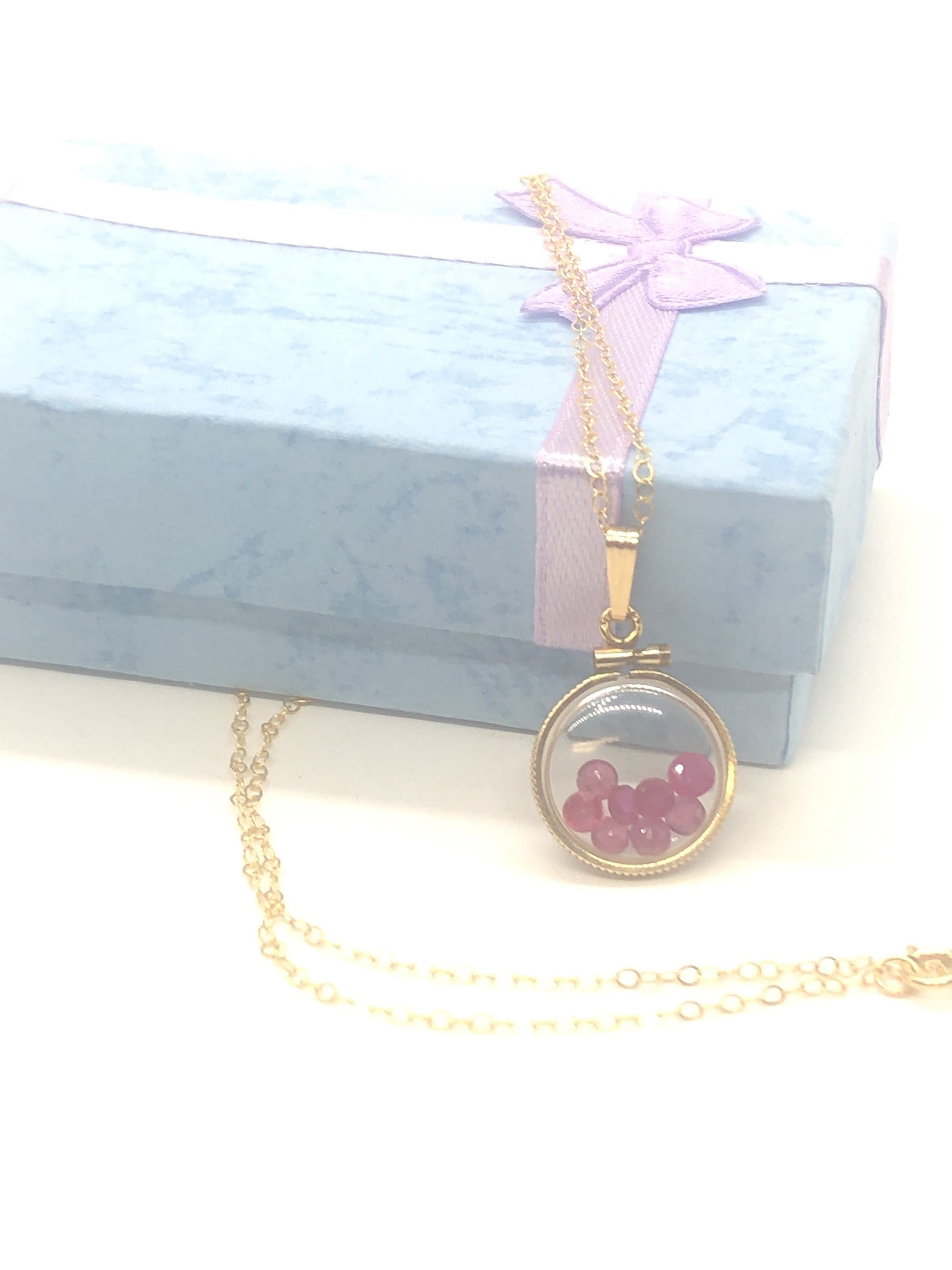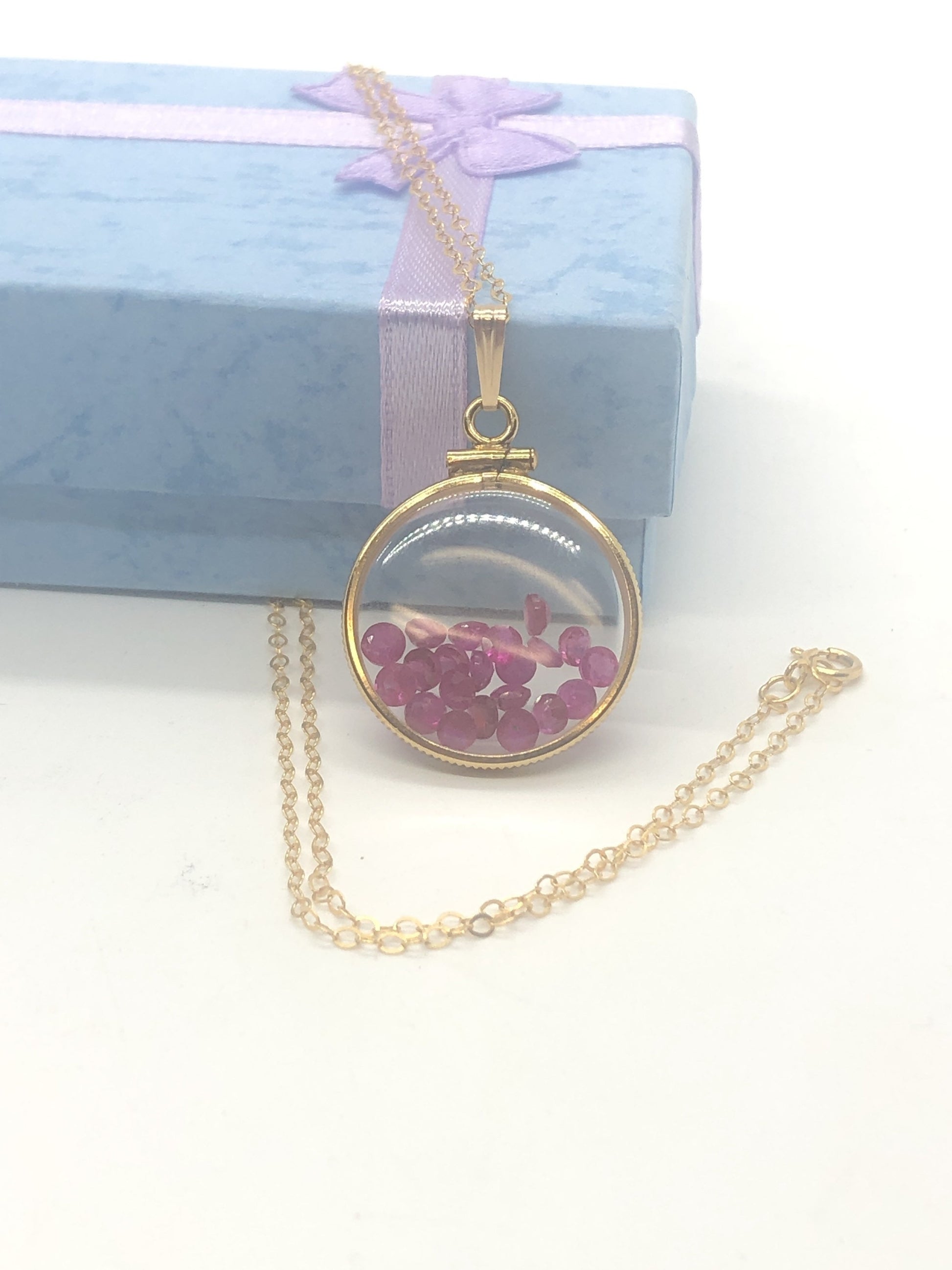 Up for sale: A 20 mm or 15 mm Vintage 12k gold filled shaker locket glowing RED with JULY'S birthstone gems inside. If your birthstone is RUBY (birthstone for July) or you just like cool eye catching vintage jewelry, then this locket is for you. I inherited these wonderful lockets (empty) from my grandfather who made and sold jewelry in his shop in Leadville, Colorado closing in the early 70's. The locket components have been stored for over 50 years and have survived time quite nicely. They are new, old stock and have never been worn. I've added a new 18 inch 14k gold filled cable chain, an embossed pinch bail, and a few new gemstones to create an eye catching creation. Please see my other auctions for additional creations with these lockets. These are hand made so some small difference may be seen in any duplicate lockets